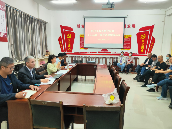 2023年5月23日,机电工程系召开专题会议,开展了“个人品德”“社会公德”“职业道德”主题学习实践活动,系主任冯凯主持学习实践活动。