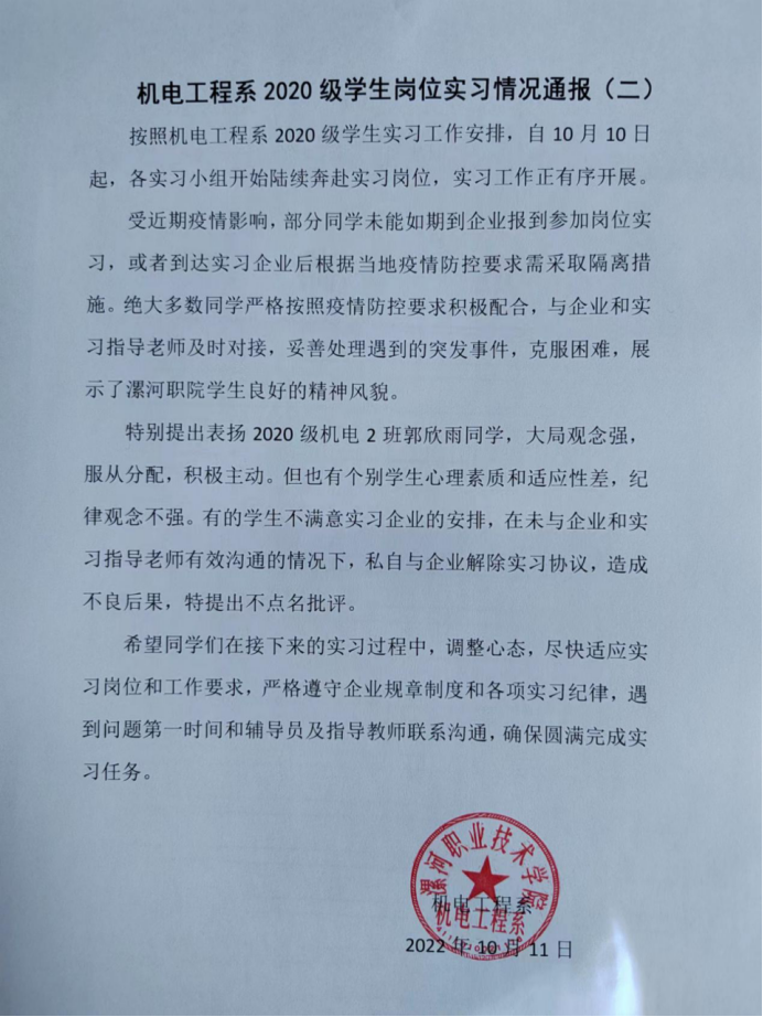 机电工程系2020级员工岗位实习情况通报(一)