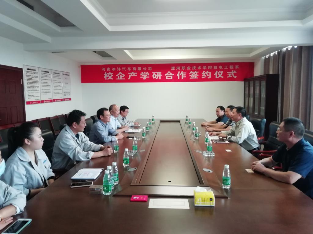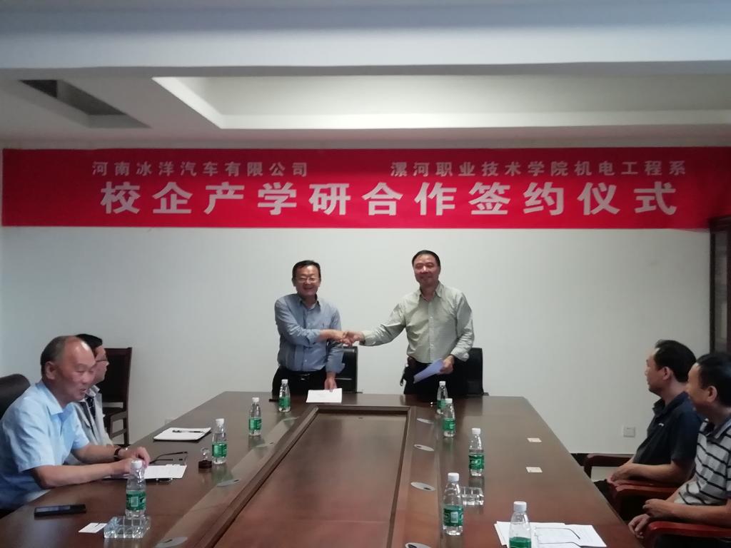 9月29日,机电工程系与河南冰洋汽车有限公司产学研合作签约仪式在河南冰洋汽车有限公司成功举行。河南冰洋汽车有限公司董事长胡建成、漯河市淞江产业集聚区驻厂第一书记书记胡彦春、河南冰洋汽车有限公司副总经理孟永伟、机电工程系行政负责人赵建功等出席签约仪式,签约仪式由胡彦春主持。