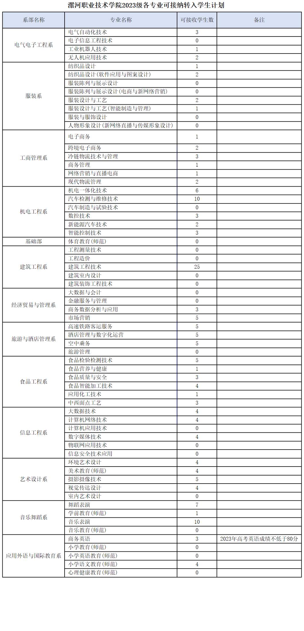 为充分调动员工学习的积极性和主动性,提升人才培养质量,有利于员工个性发展和特长的发挥,按照《bevictor伟德官网员工转专业管理办法》(漯职院政发〔2022〕136号),根据各专业教学资源状况,现将各专业可接纳转入员工计划数,予以公布。